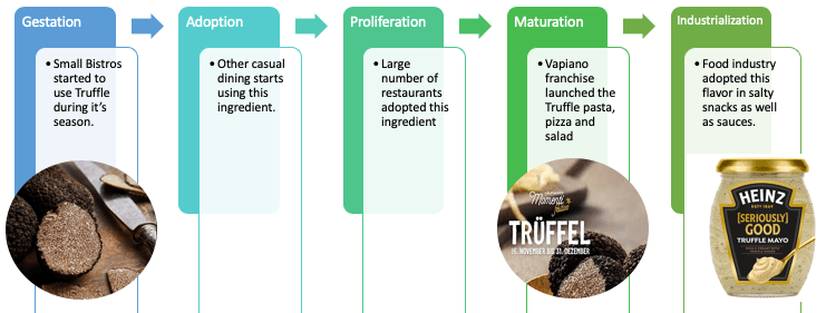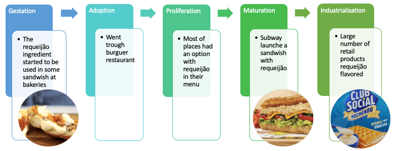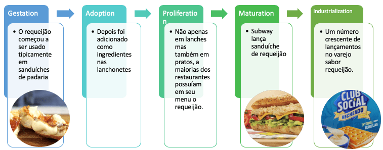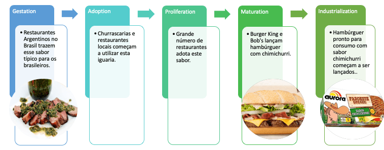 Gestation: o nascimento de uma tendência se origina tipicamente em restaurantes menores independentes, comida de rua e ou com chefes culinários. Adoption: Neste estágio, você vai ver ingredientes, sabores, formatos e conceitos sendo utilizados em um número mais de restaurantes. Proliferation: Agora no estágio de proliferação você acha com facilidade essa novidade em todos os tipos de restaurantes. Maturation: Neste estágio, o que chamamos de QSR (Quick Service Restaurant) que são os fast foods começam a lançar essa novidade em seu menu. Industrialization: no estágio final, essa tendência vai também para o varejo e as indústrias fazem seus lançamentos com essa novidade do momento.